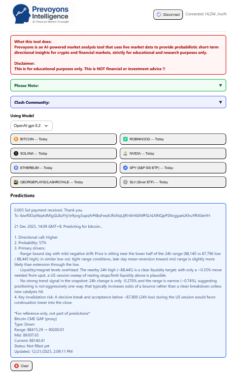 4. Click the Bitcoin button to get an AI prediction for the current trading day.